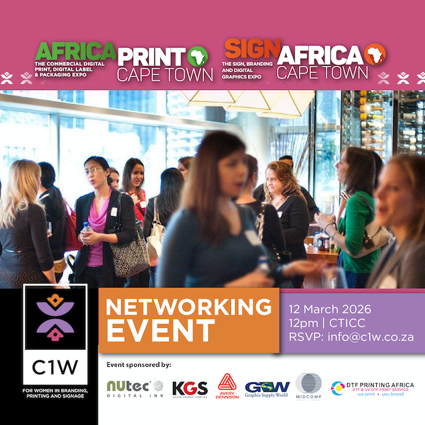 Visit the Africa Print Expo and then join us at the free networking event from 12pm on 12 March. RSVP for the networking event at info@c1w.co.za. Register for free entrance to the Africa Print expo.