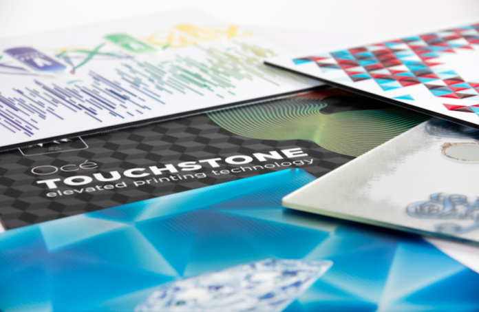 Materials printed on the Océ Arizona can now be enhanced with unique textures, low relief or metallic accents for eye-catching effects, with broad appeal for a number of markets, including signage, décor and packaging. It takes a flatbed technology with perfect registration, such as one of the Océ Arizona Series printers, to achieve the reliable and accurate dot placements for optimum elevated print results. Océ Touchstone enables PSPs to add an exciting, tactile element to their offering.’