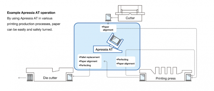 It is an addition to the Apressia brand range that comprises post-processing machines such as cuttings, die cutters and blanking systems. At this event, the company also demonstrated an Apressia AT120H model with a maximum stack height (including pallet) of 2000mm that has a pallet clamp function that enables pallet and paper centring.