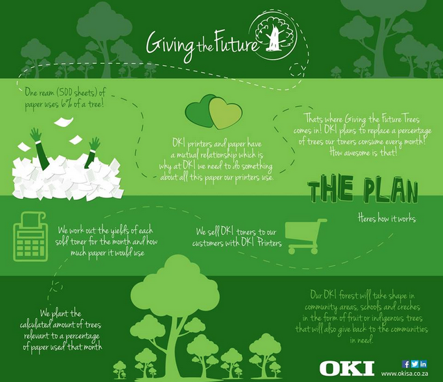As a paper consumer through their printer sales, OKI South Africa has launched the ‘Giving the Future Trees’ initiative to help reduce their carbon footprint and give back to the environment and community. Oki wants to ensure they give back as much as they take from natural resources to ensure the future of our planet.