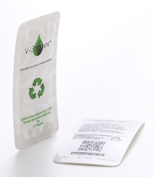 Because they are mono-polymer construction, they add no polyethylene or PET to the recycling stream that would downgrade their recyclability as is the case with other barrier materials and their mono-polymer construction makes them widely recyclable around the globe. They also create the same size and weight sachets as other 100% recyclable materials used by V-Shapes.