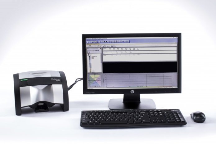 The device features an adjustable aperture size, ranging from 2mm to 12mm, enabling measurement of a wide range of samples. Users can measure difficult samples such as small and non-planar items as well as liquids, pastes, powders and gels without contaminating the instrument or damaging the sample. Adaptable accessories for MetaVue VS3200 include an instrument stand to place the instrument three inches above a table with replaceable trays that slide in and out; an adjustable stand for accurate measurement of samples with varying thickness; and a benchtop stand that converts the instrument to a benchtop with a sample arm for measuring objects such as plastic parts.